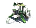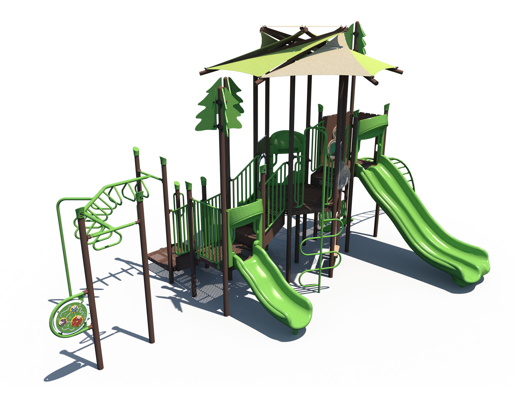 This nature-themed playground with shade is a great addition to schools and parks. It features multiple slides and climbers. This playground is designed for children ages 5-12 years.