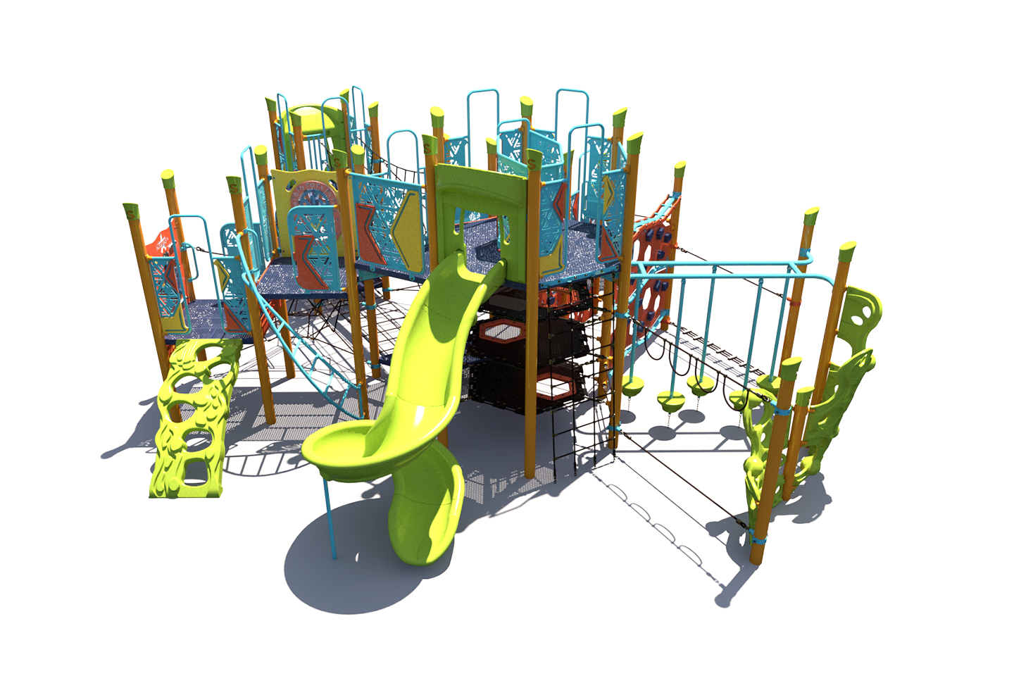If you're looking for a modern playground, consider the FX5-PRF-512-0650. This play structure is designed with fun and exciting climbers and rope bridges for children ages 5-12. This playground would make a great addition to any school or park play space.