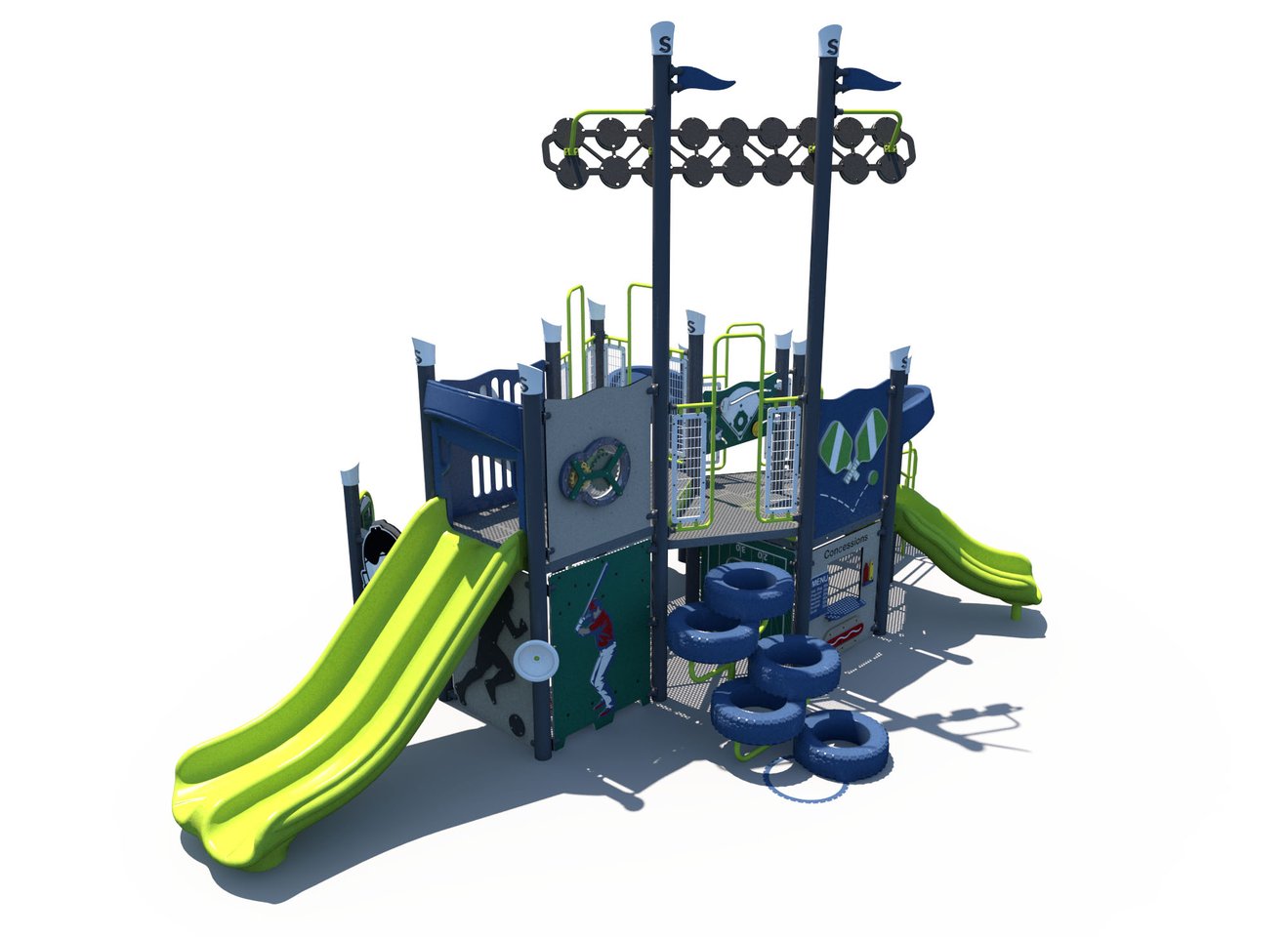This all sports themed playground includes theming related to baseball, soccer, football, and more! This sport playground is designed for children ages 2-5 years.