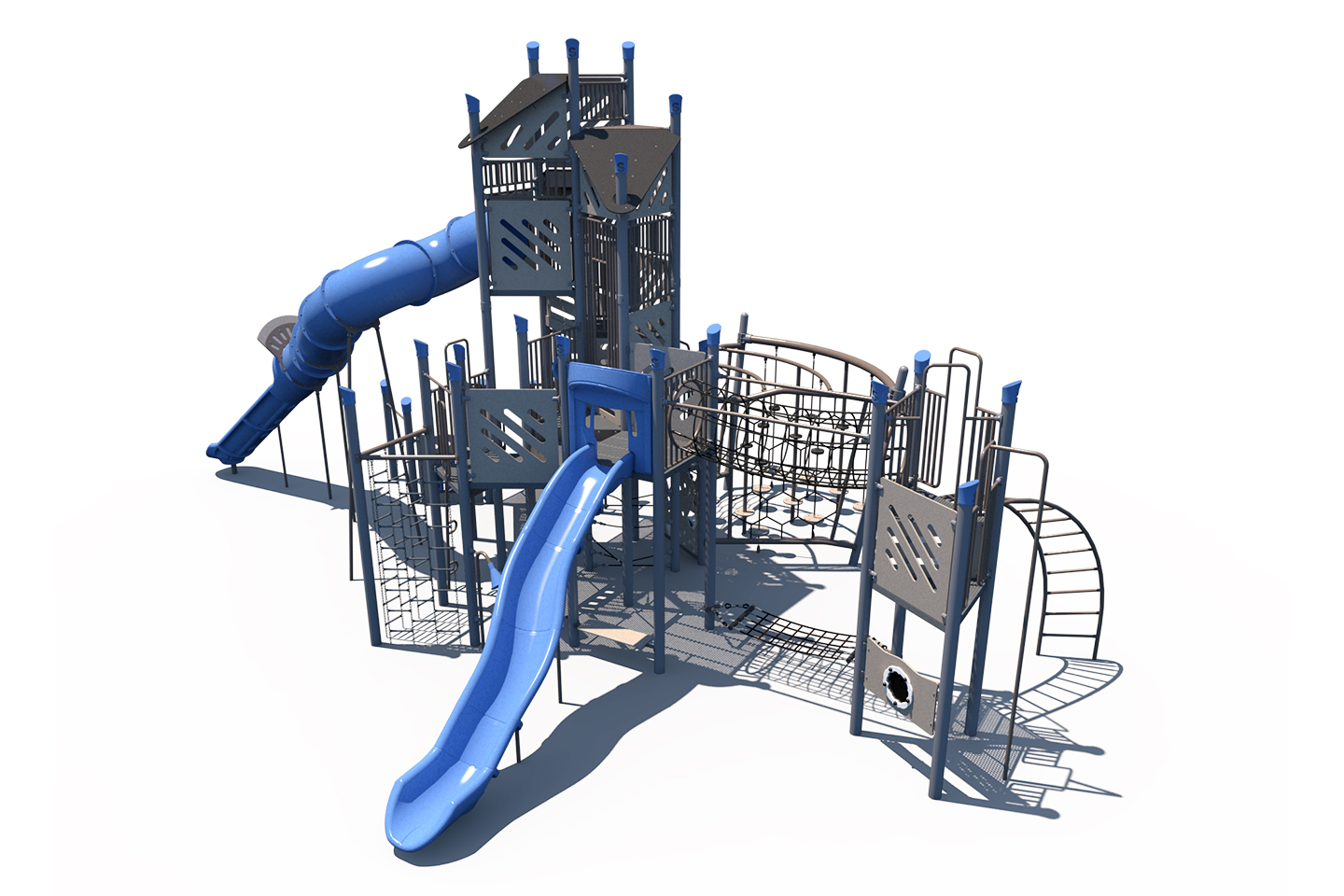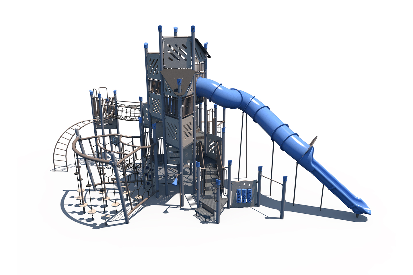 As a Kaiju structure, the FXT-GEN-512-0061 is designed with a variety of interconnected climbing elements like nets, ropes, and walls that allow children to explore, balance, and scale at their own pace. Designed to promote physical development and imaginative play, this Kaiju system keeps kids engaged on and off the deck, offering endless ways to climb, crawl, and connect. Children can also reach new heights with the tower and a thrilling ride down the slide. This playground is for the 5-12 age group.