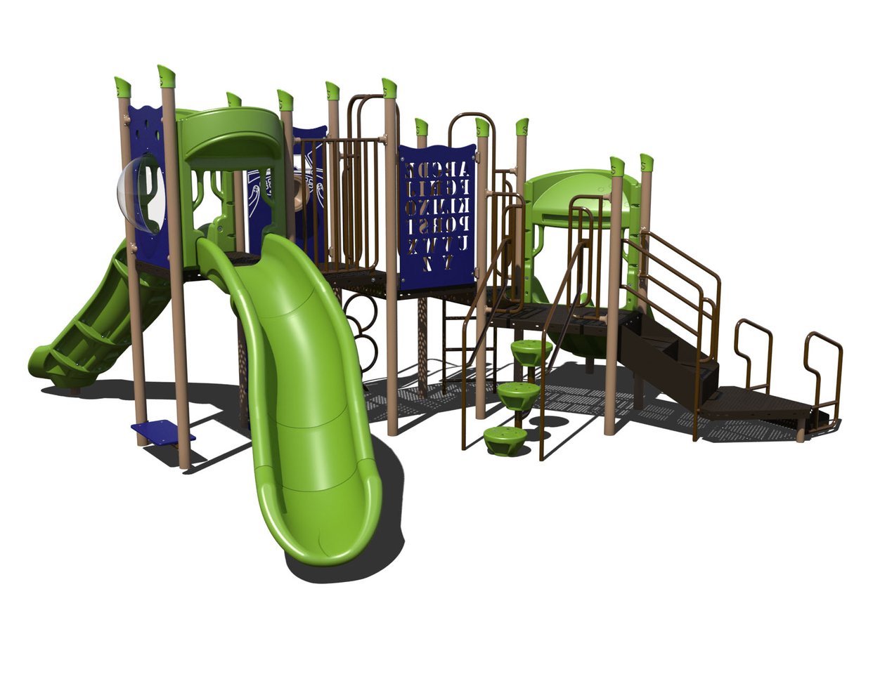 The PS3-31414-1 is a commercial playground unit that allows children to navigate through the play course and experience lively outdoor play. This playground is equipped with two chute slides and a triple rail slide. This playground has panels that include an alien maze panel, a spaceship panel, and an animal spinning panel allowing children to participate in interactive play. Choose through the different color options and start planning your next outdoor playground today.