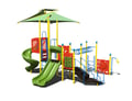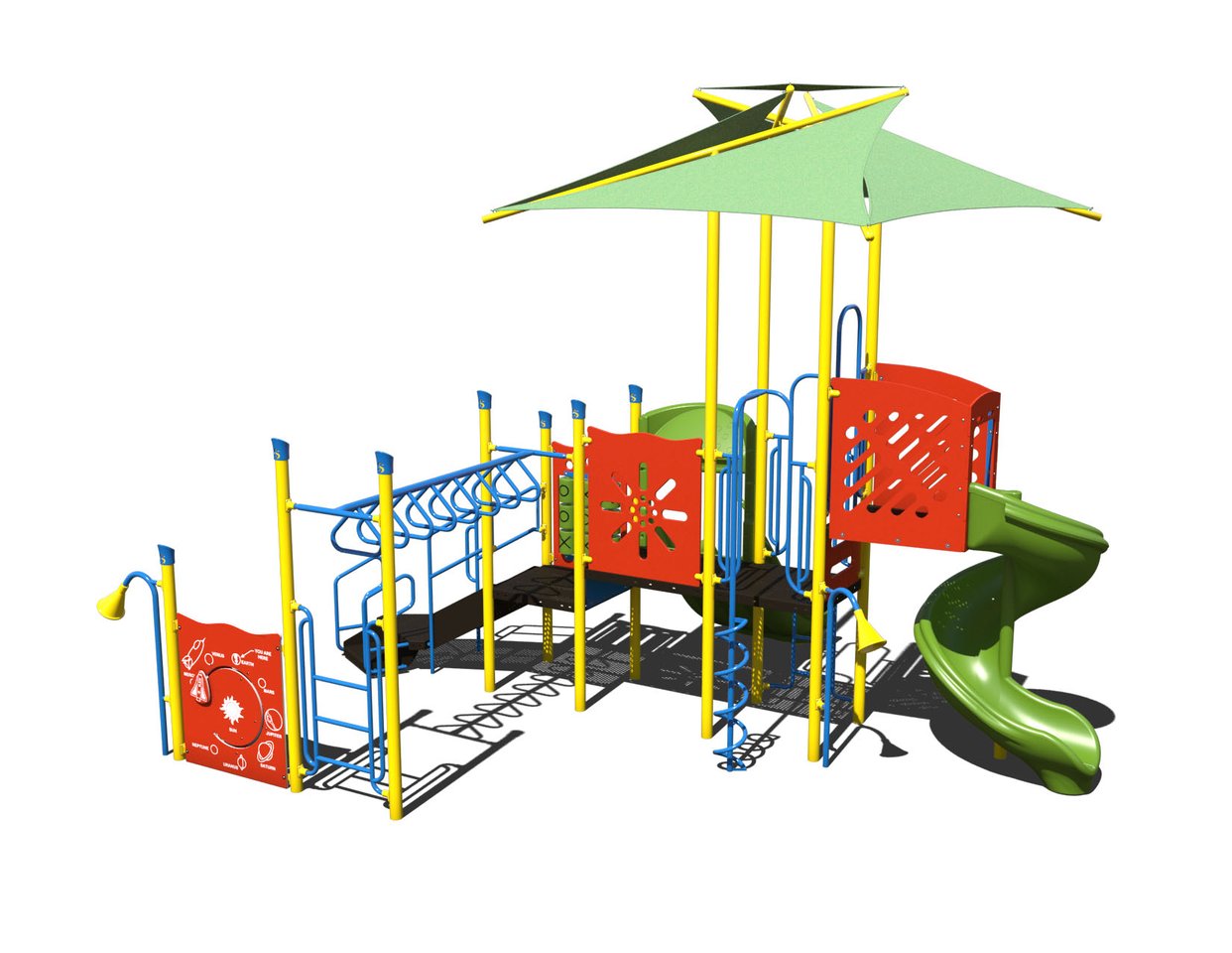This shaded playground features two slides, two climbers, multiple activity panels, two talk tubes, and an overhead rung ladder.