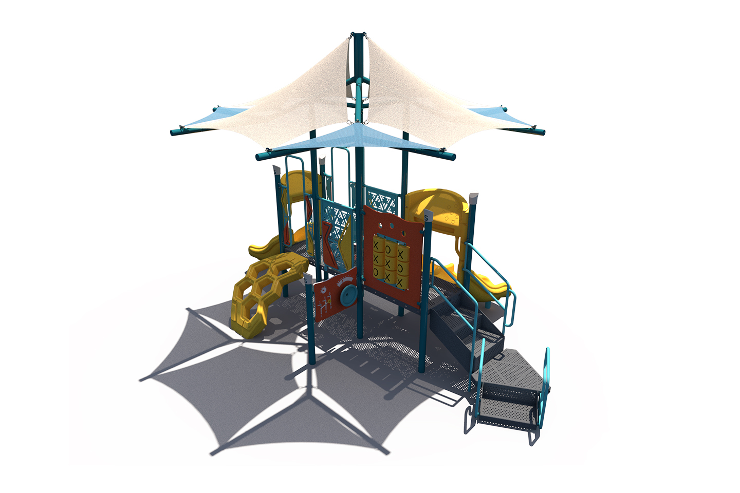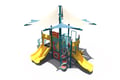 The PS3-73657 makes a great addition to any park or school. This outdoor steel playground is designed fun and exciting slides, climbers, and play panels. It's perfect for children in the 2-5 age group. It includes an integrated shade to help with sun protection.