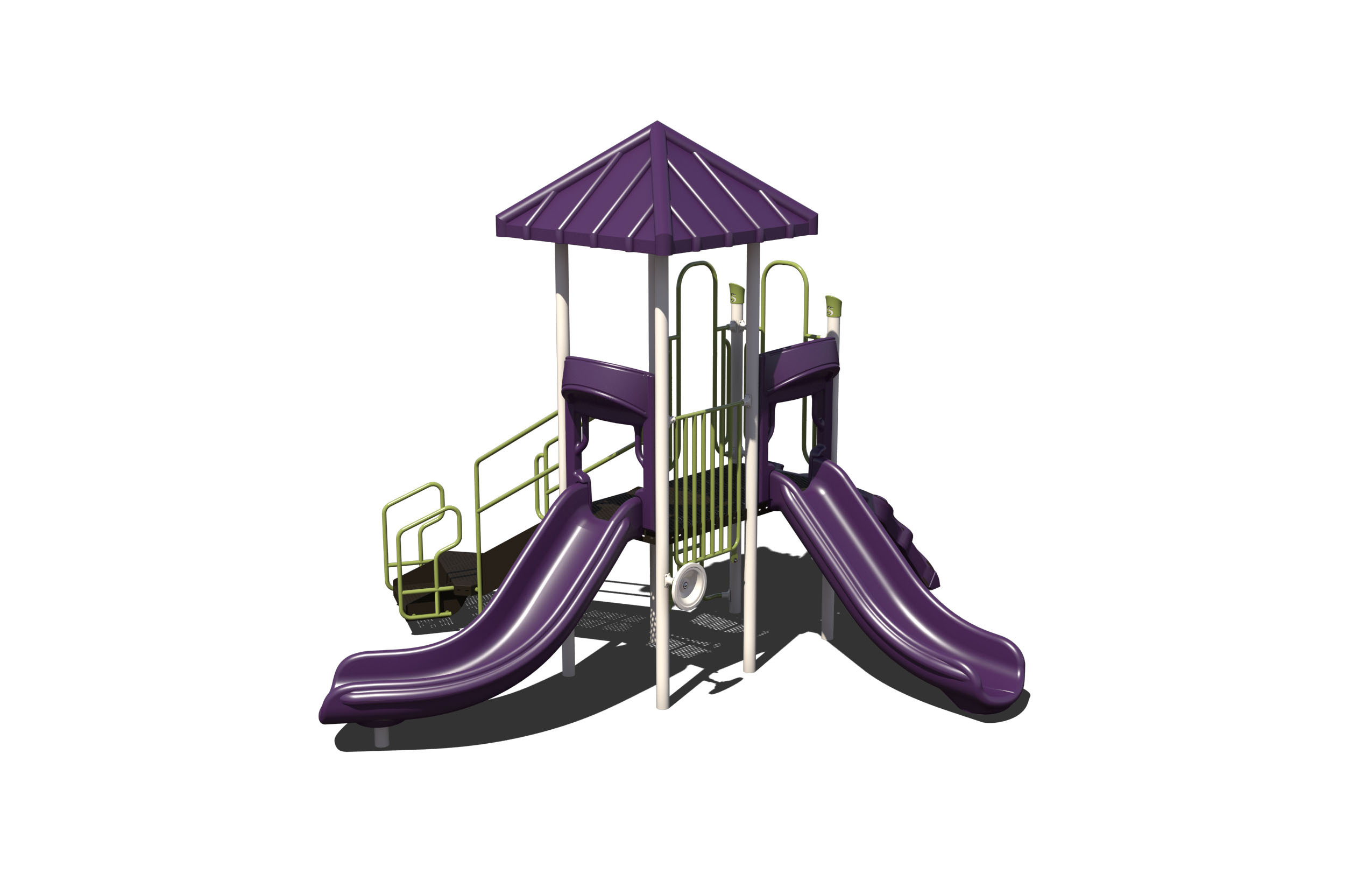This small, all-age playground is great for tight spaces, child development centers, churches, and more. It features two slides and two climbers.