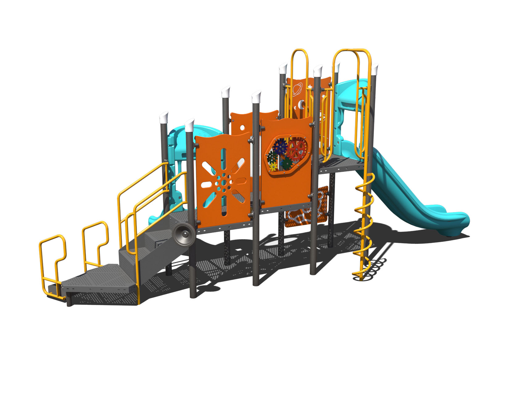 If you're looking for a playground for a tight space and that is designed for children ages 5-12 years, the PS3-73882 is for you. This three-deck playground features two slides, one climber, five activity panels, and a post-mounted steering wheel.